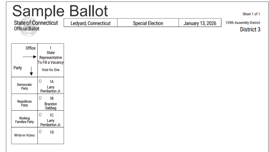 Ballot for today’s special election in Ledyard District 3. Source: CT Secretary of State Website