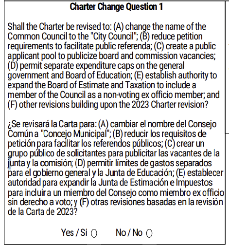 Question 1 on the Charter Change is longer and includes a couple of changes, so I will put the text here below.